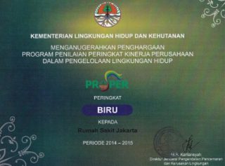 Penghargaan Program Penilaian Peringkat KinerjaPerusahaan Dalam Pengelolaan Lingkungan HidupPROPER peringkat BIRU Kepada Rumah Sakit Jakarta,Periode 2014–2015